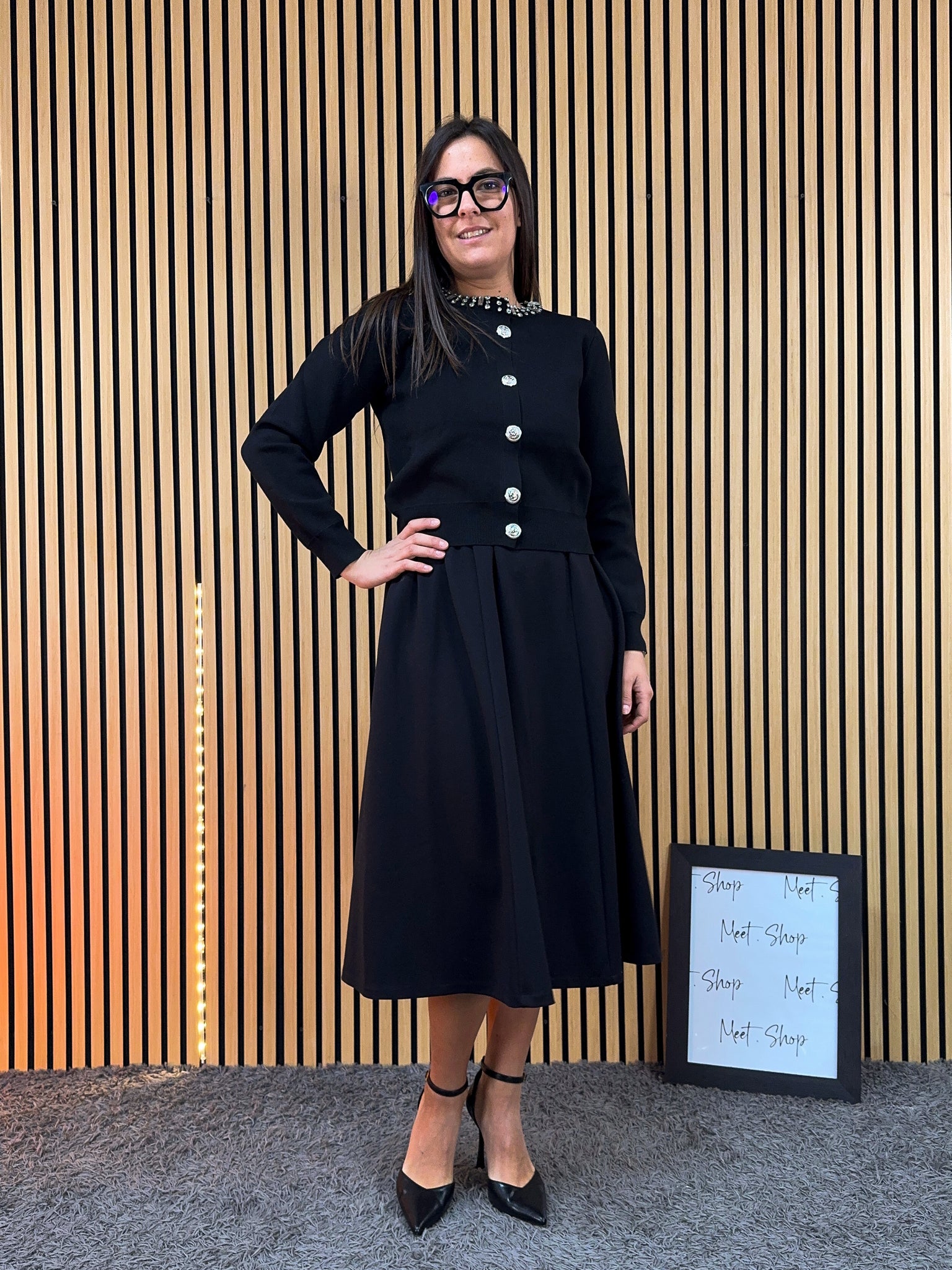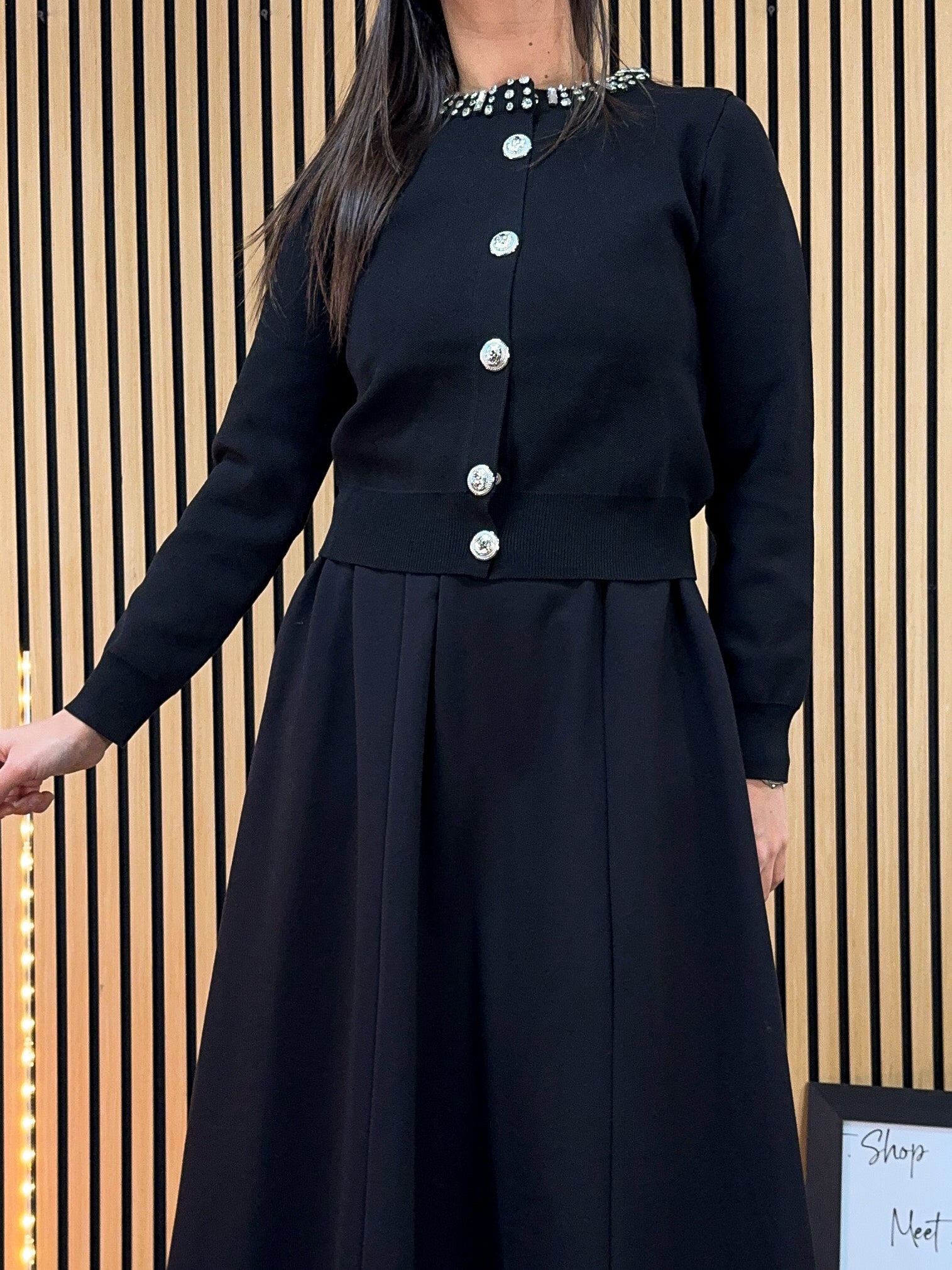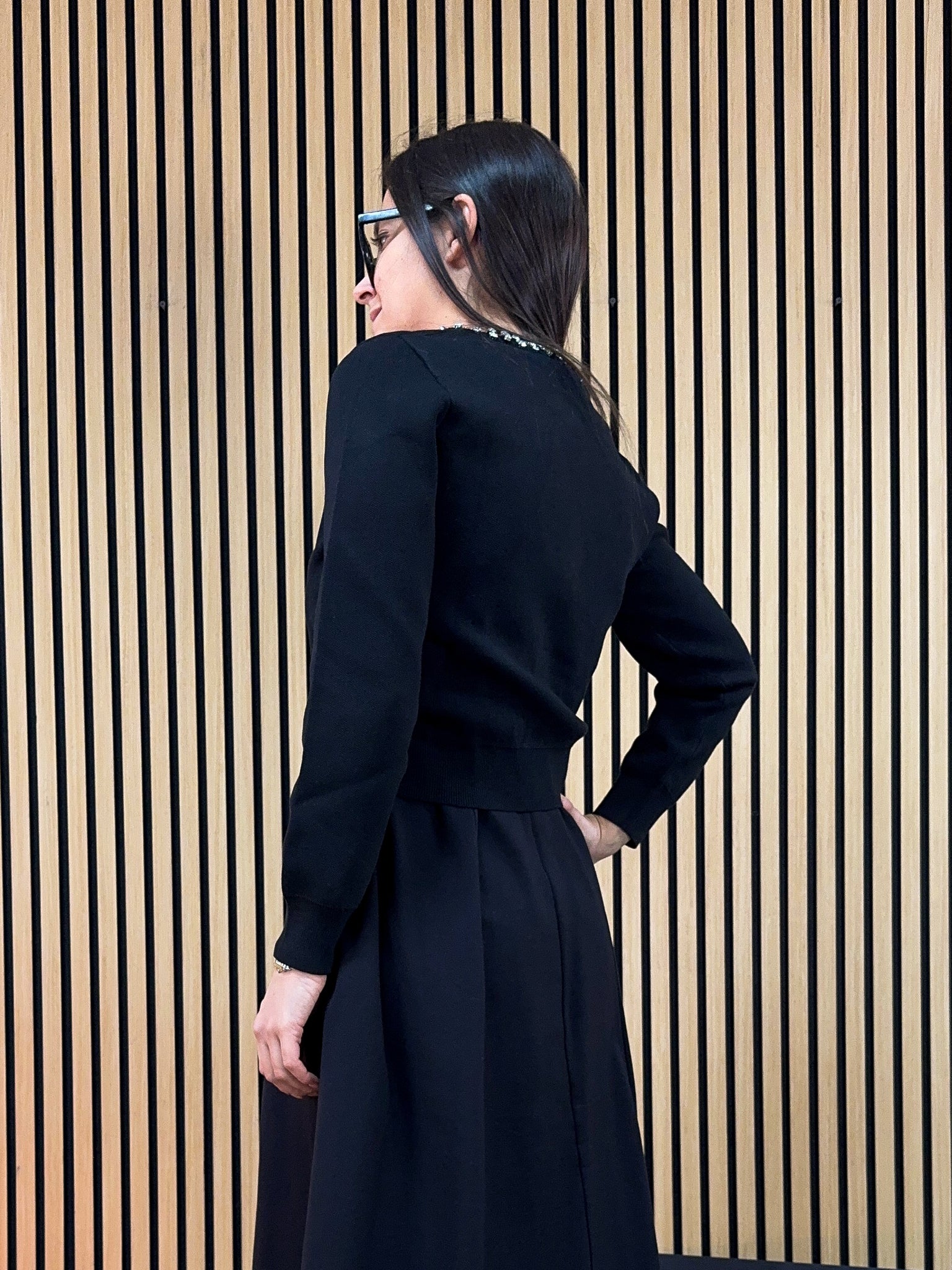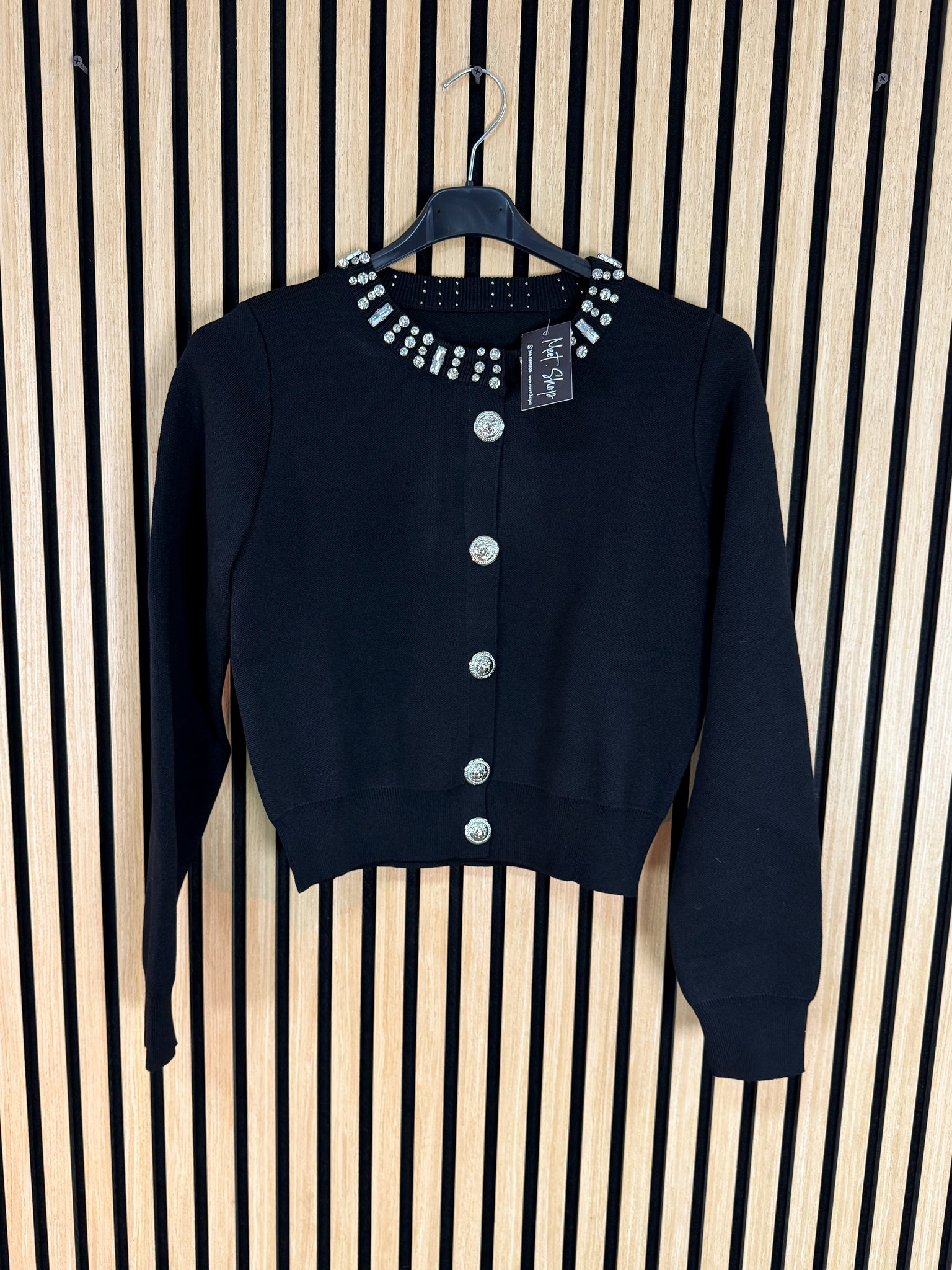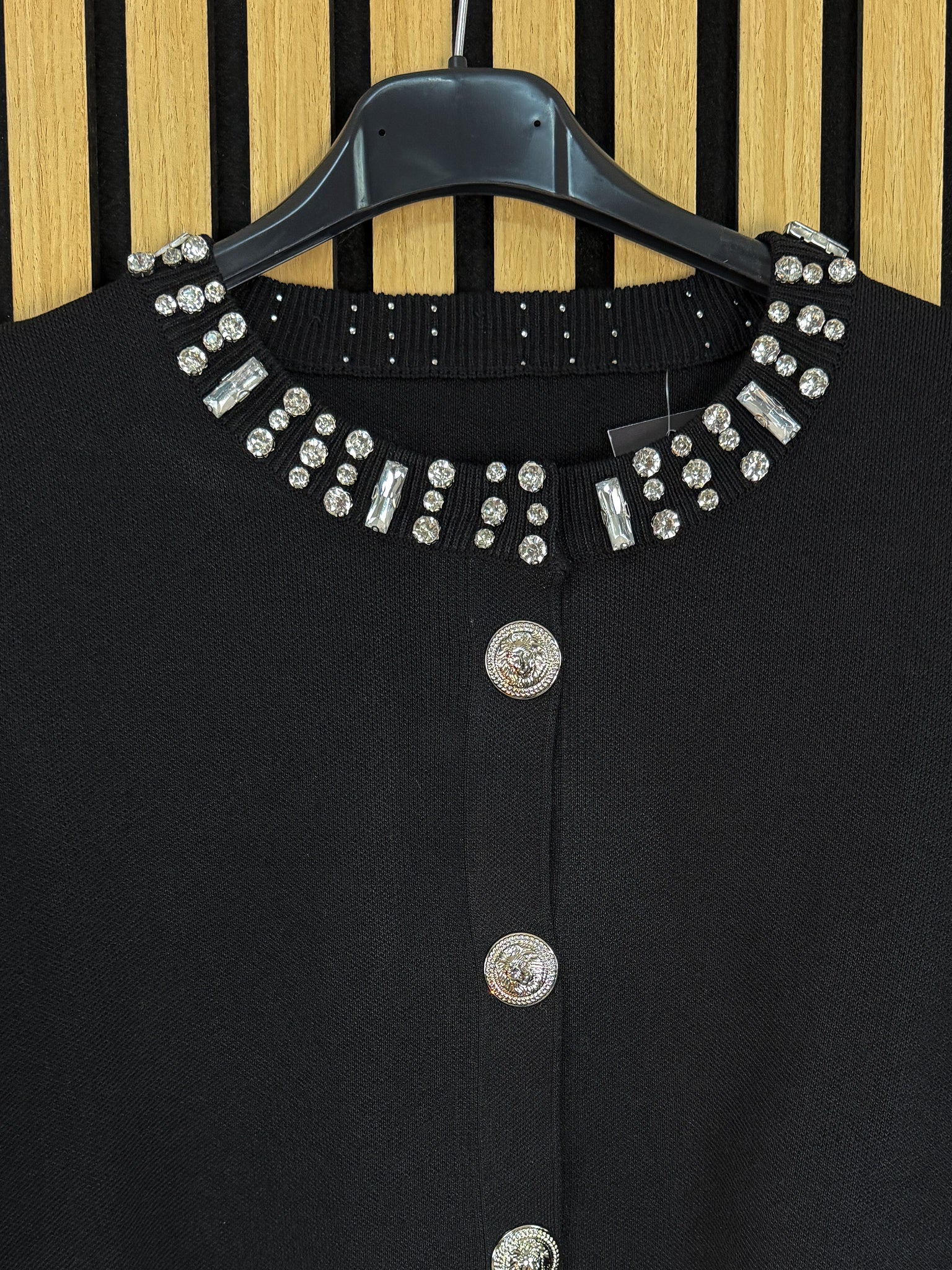 Maglione cardigan in viscosa con diamantini applicati a borchia sul girocollo e chiusura con bottoni