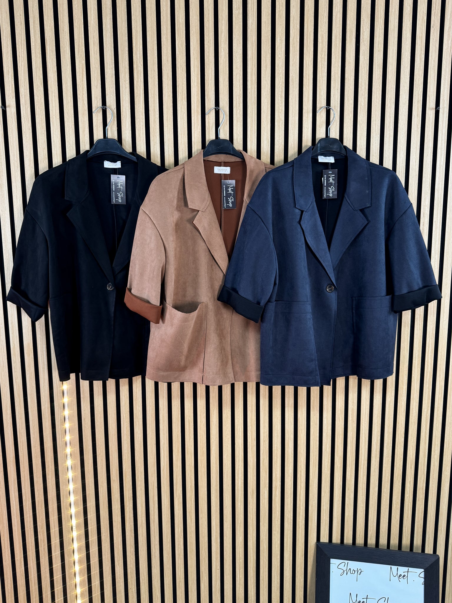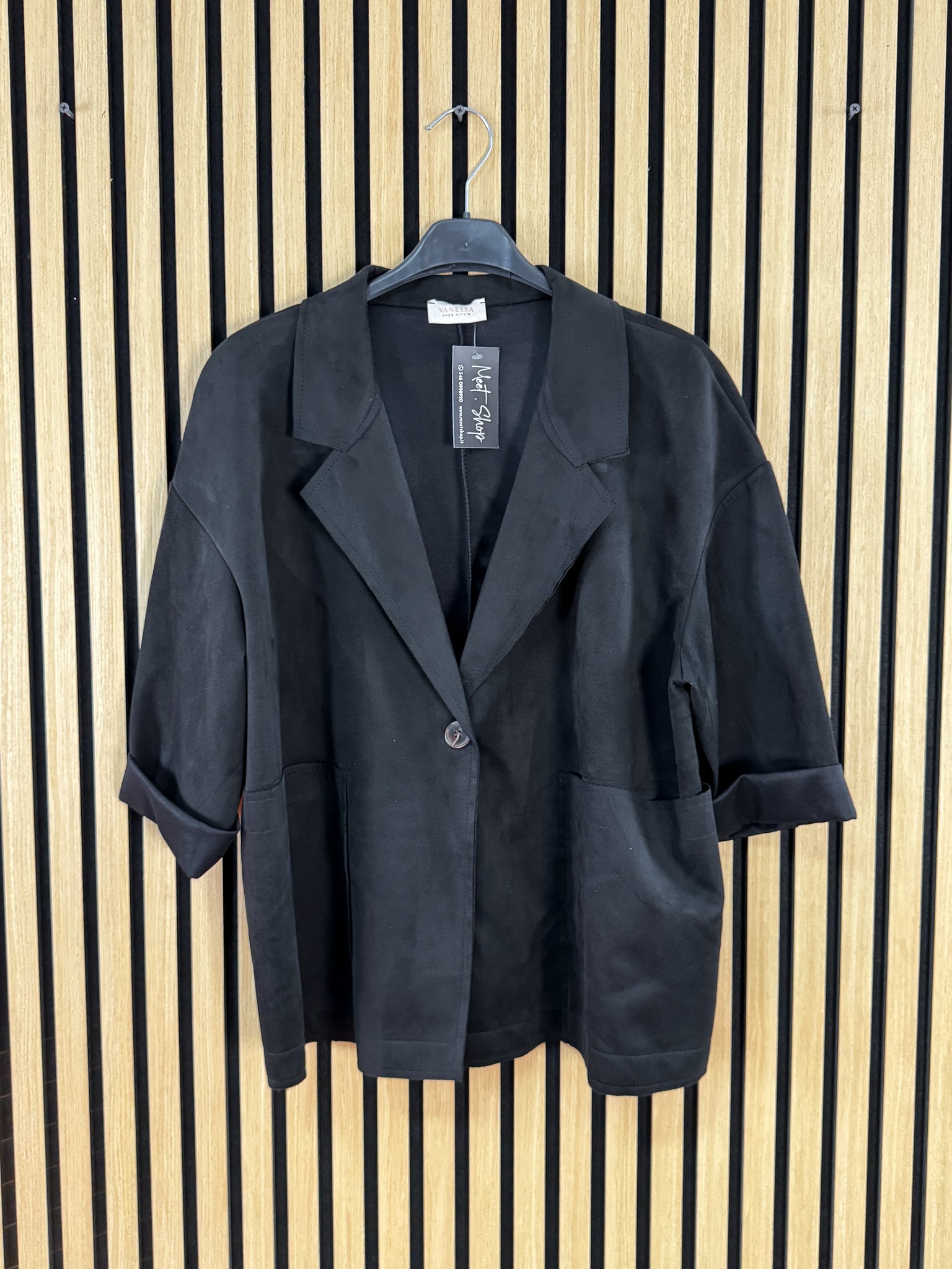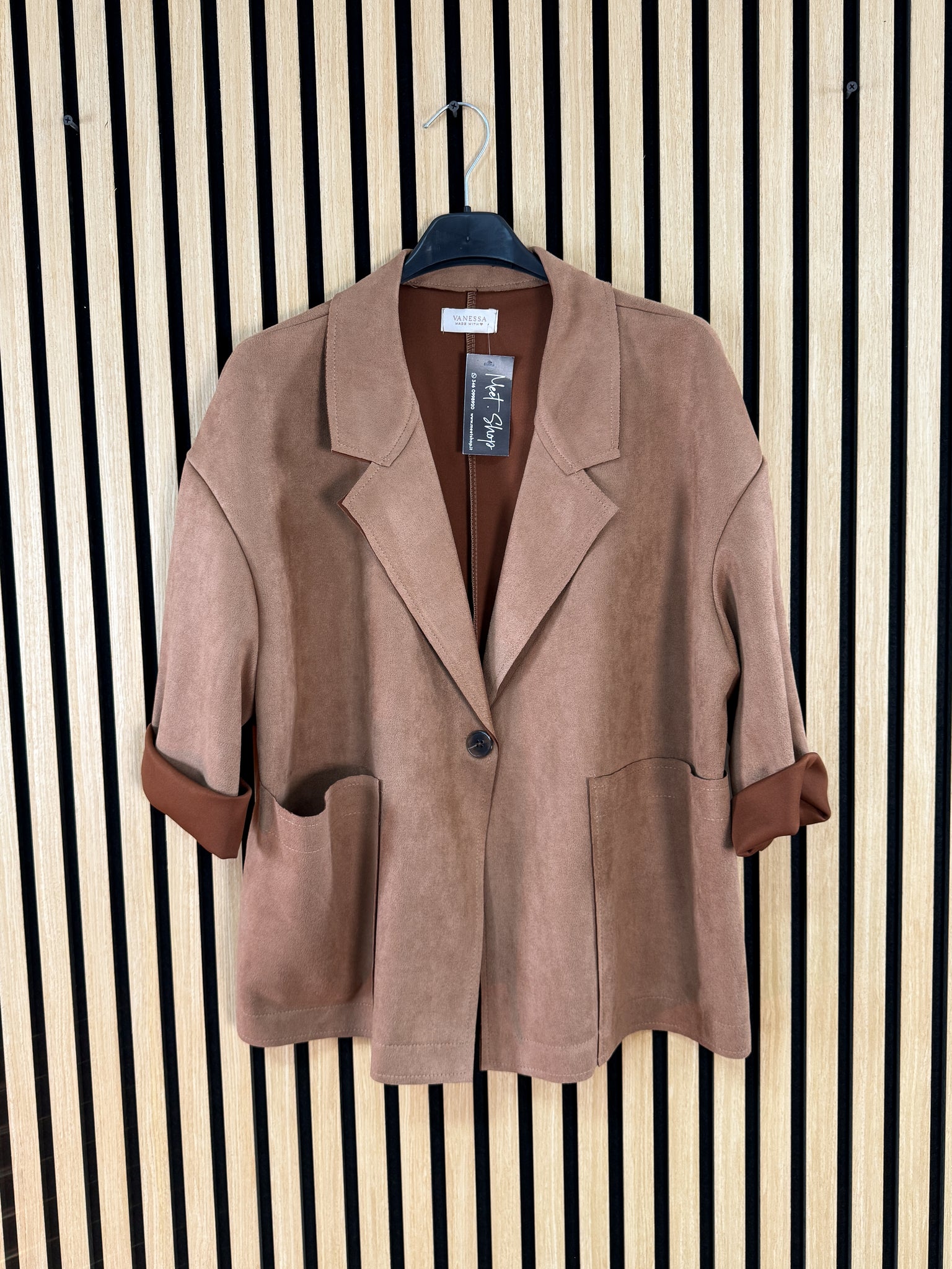 Giacca scamosciata con tasche frintali e chiusura con bottone.