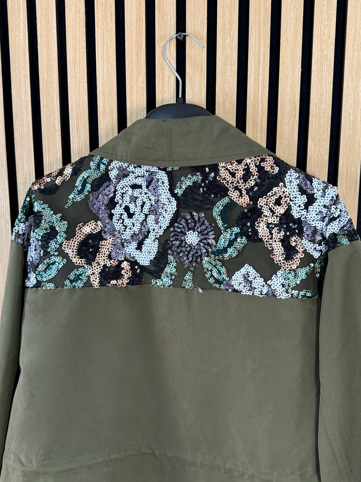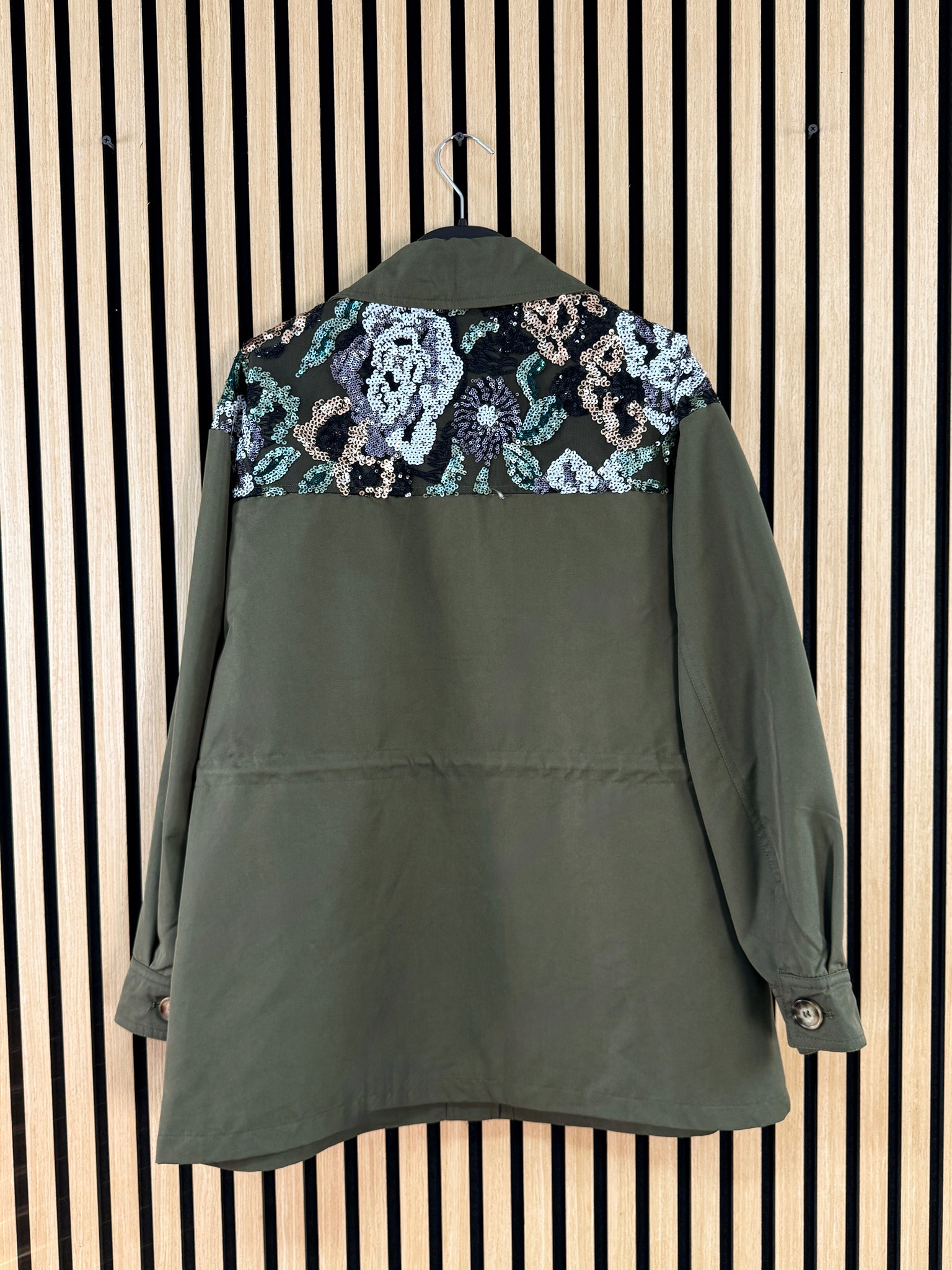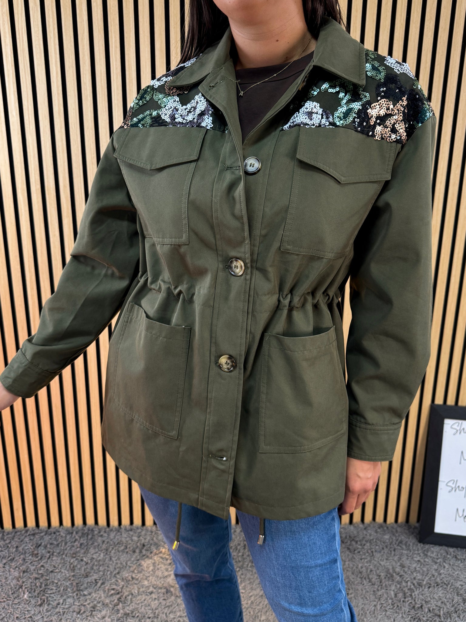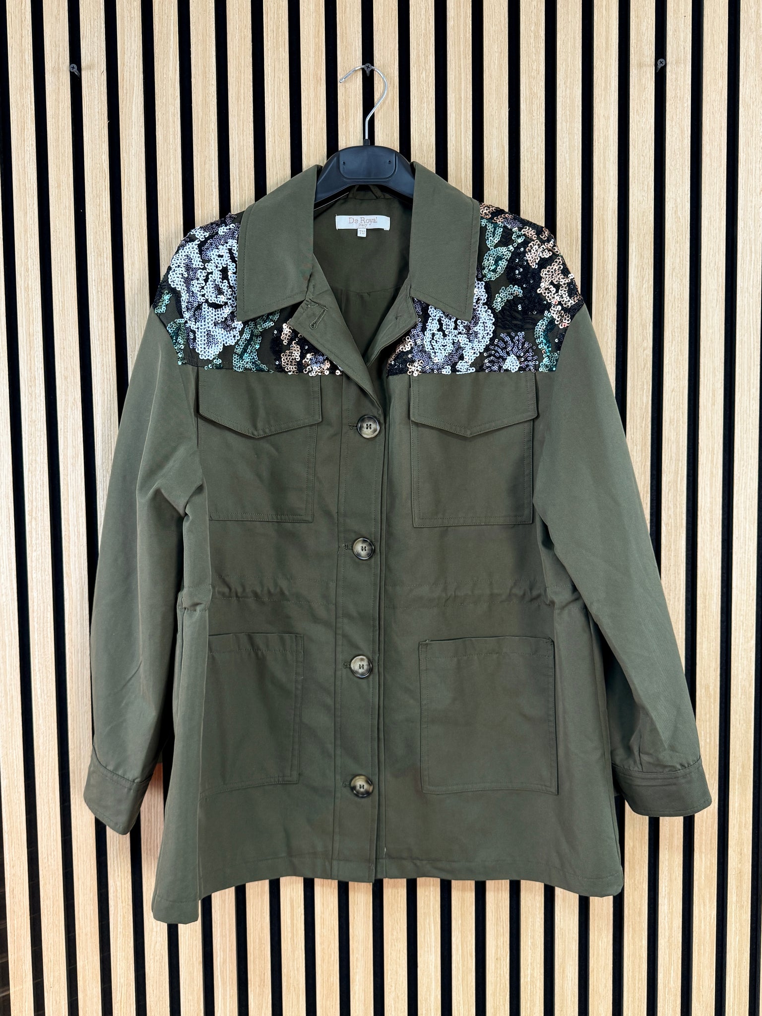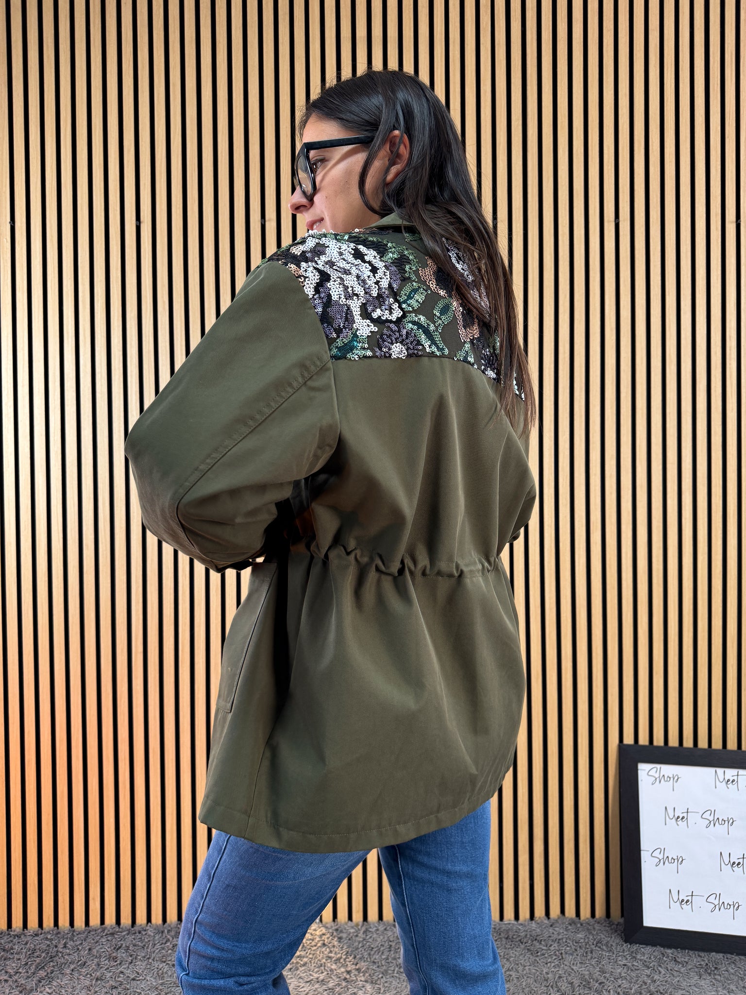 Salariana con paillette sulle spalle, chiusura a bottoni e coulisse in vita.