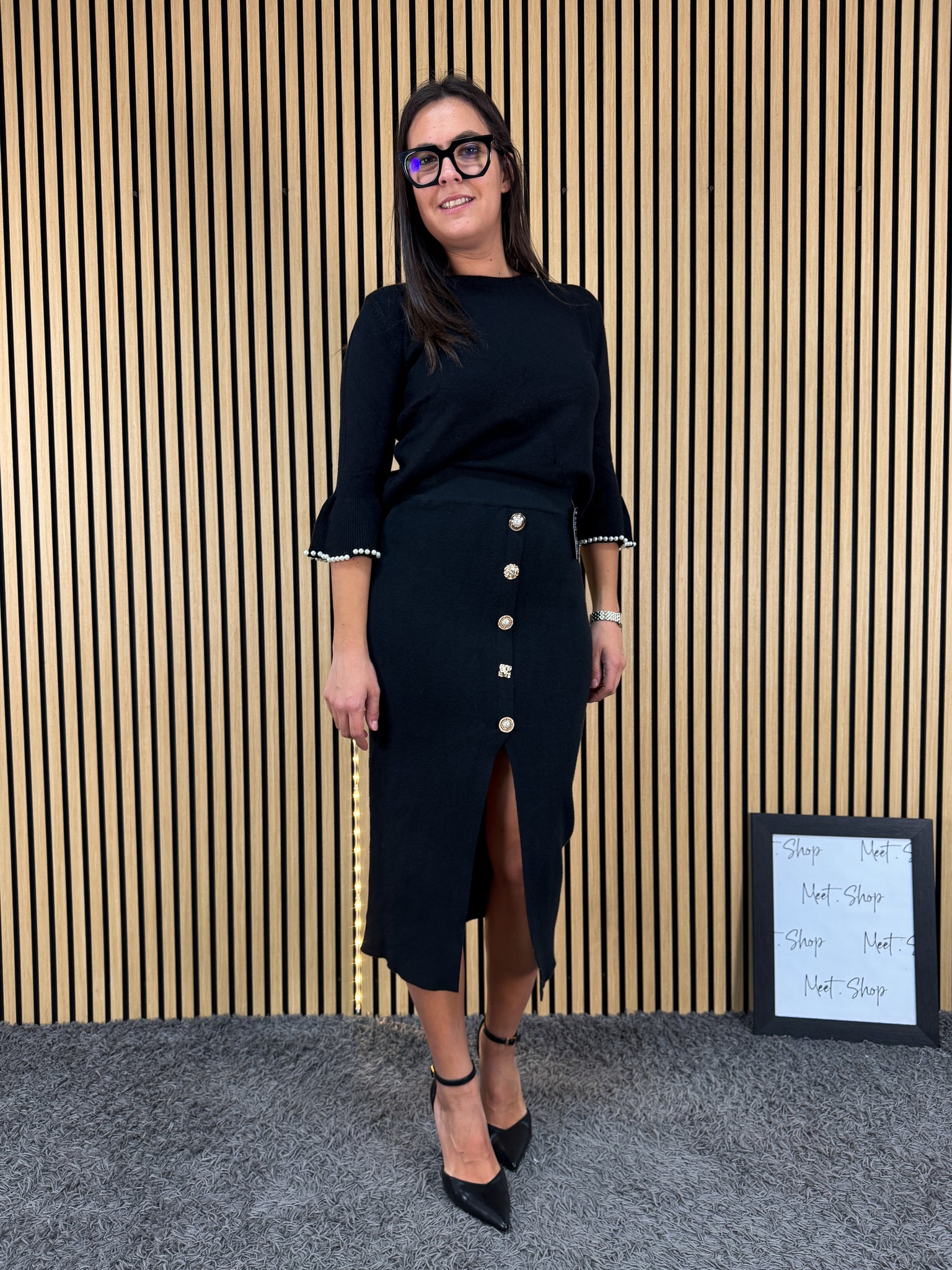 Gonna lunga in maglina di viscosa con bottoni a scopo estetico e spacco frontale