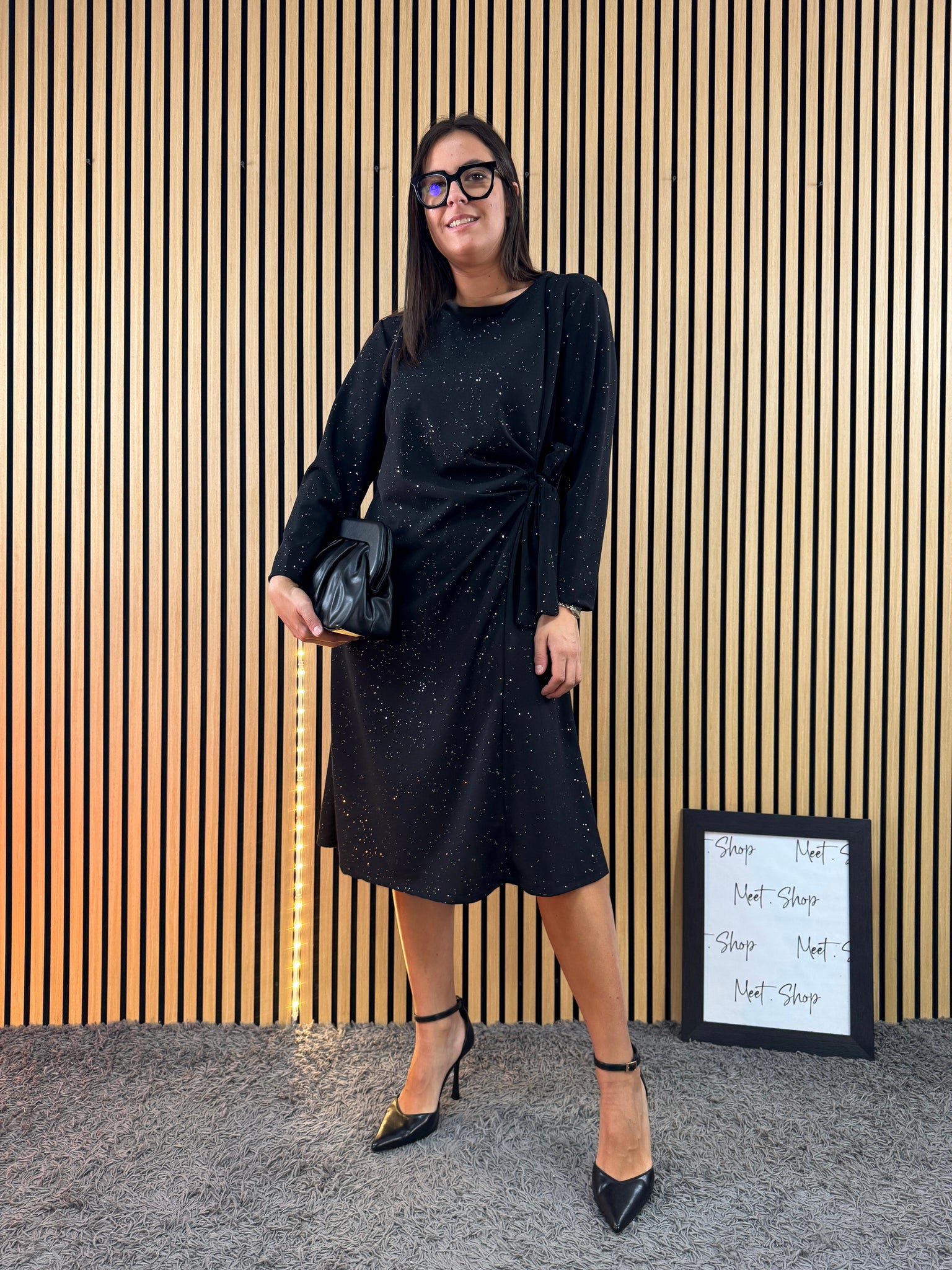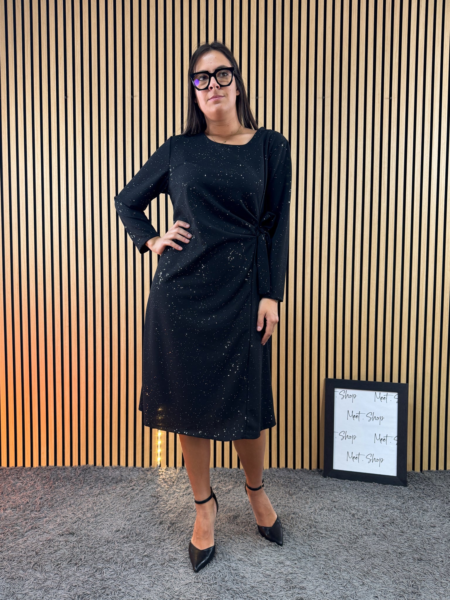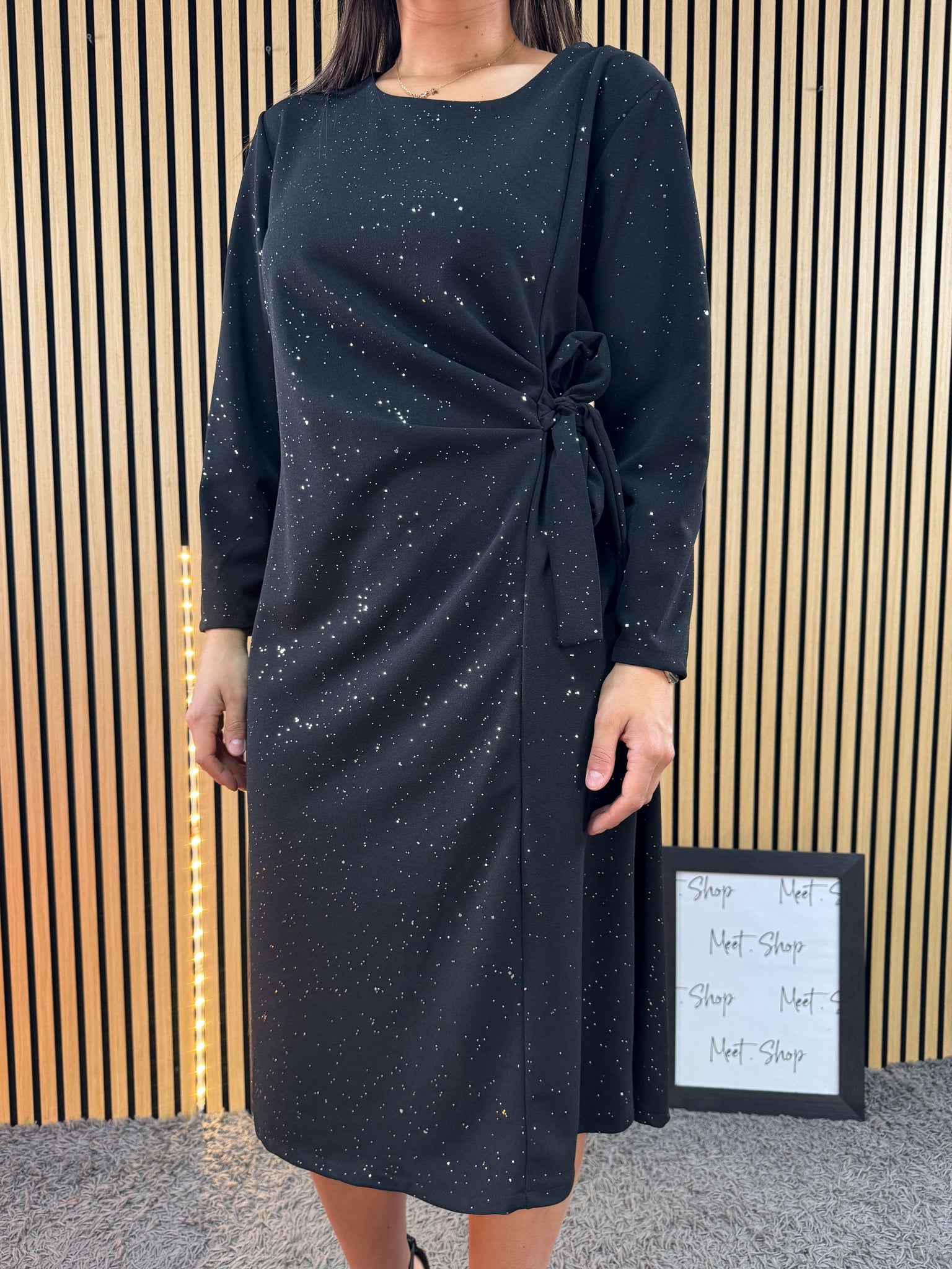 Abito curvy con cinturina sul lato, con brillantini in tutta la lunghezza.