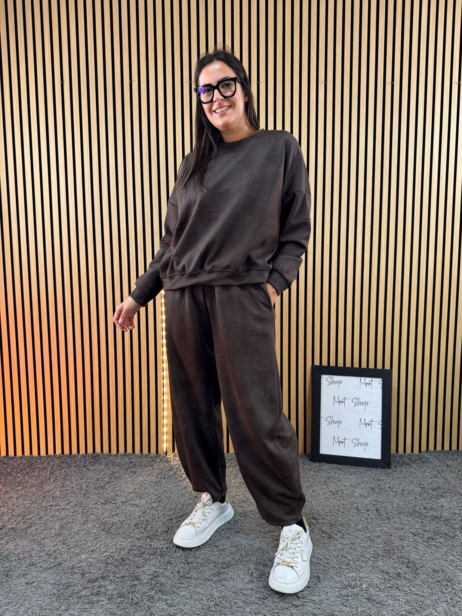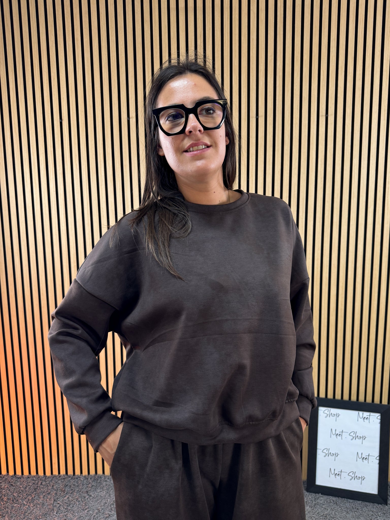 Maglia over abbinata al pantalone over Dana, effetto spalmato.