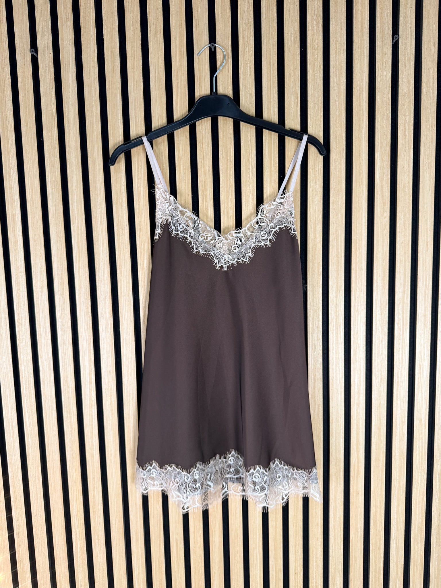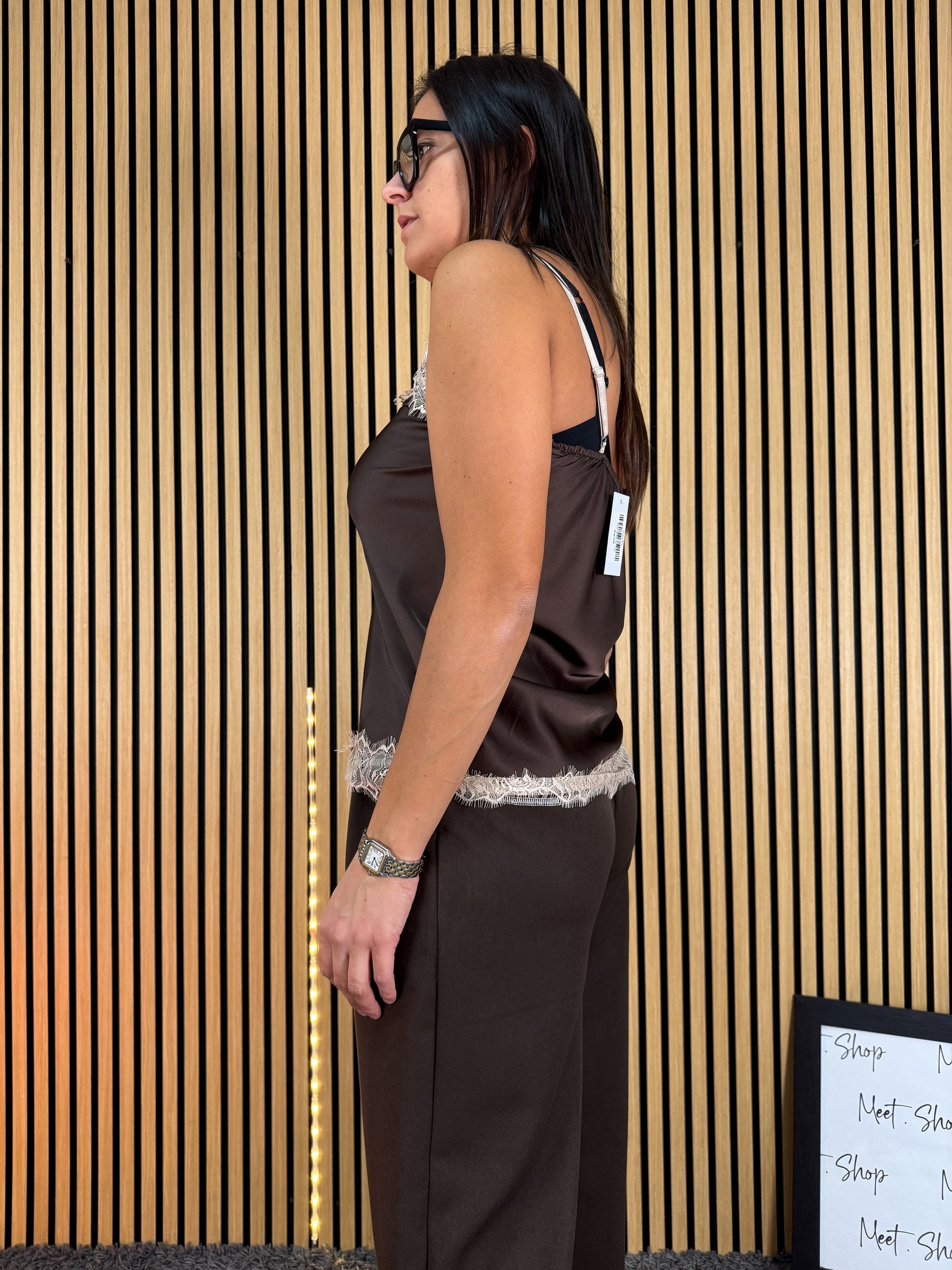 Canotta in simil raso con finiture in pizzo, spallina regolabile
