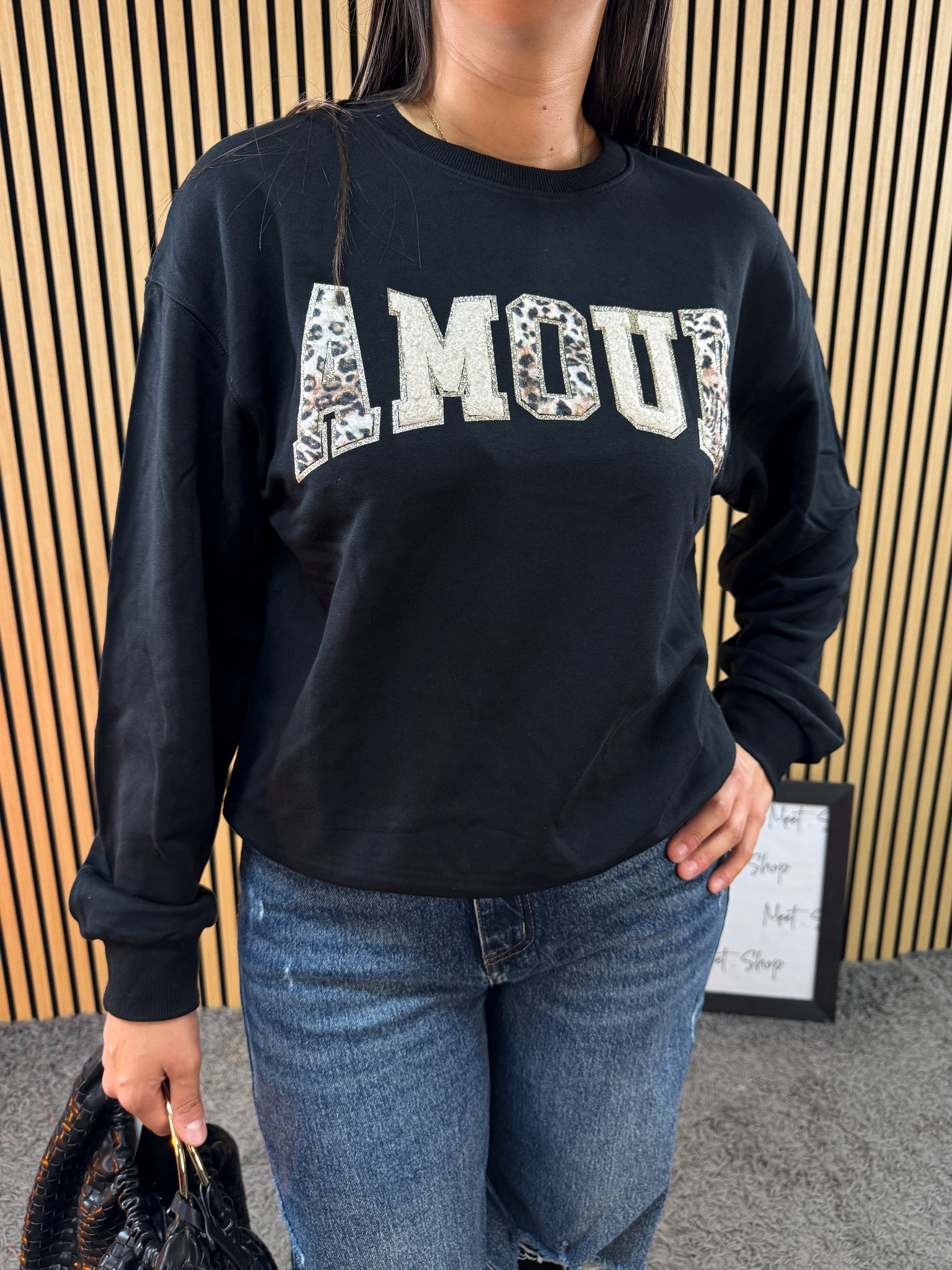 Felpa in cotone garzato con stampa e applicazione frontale.