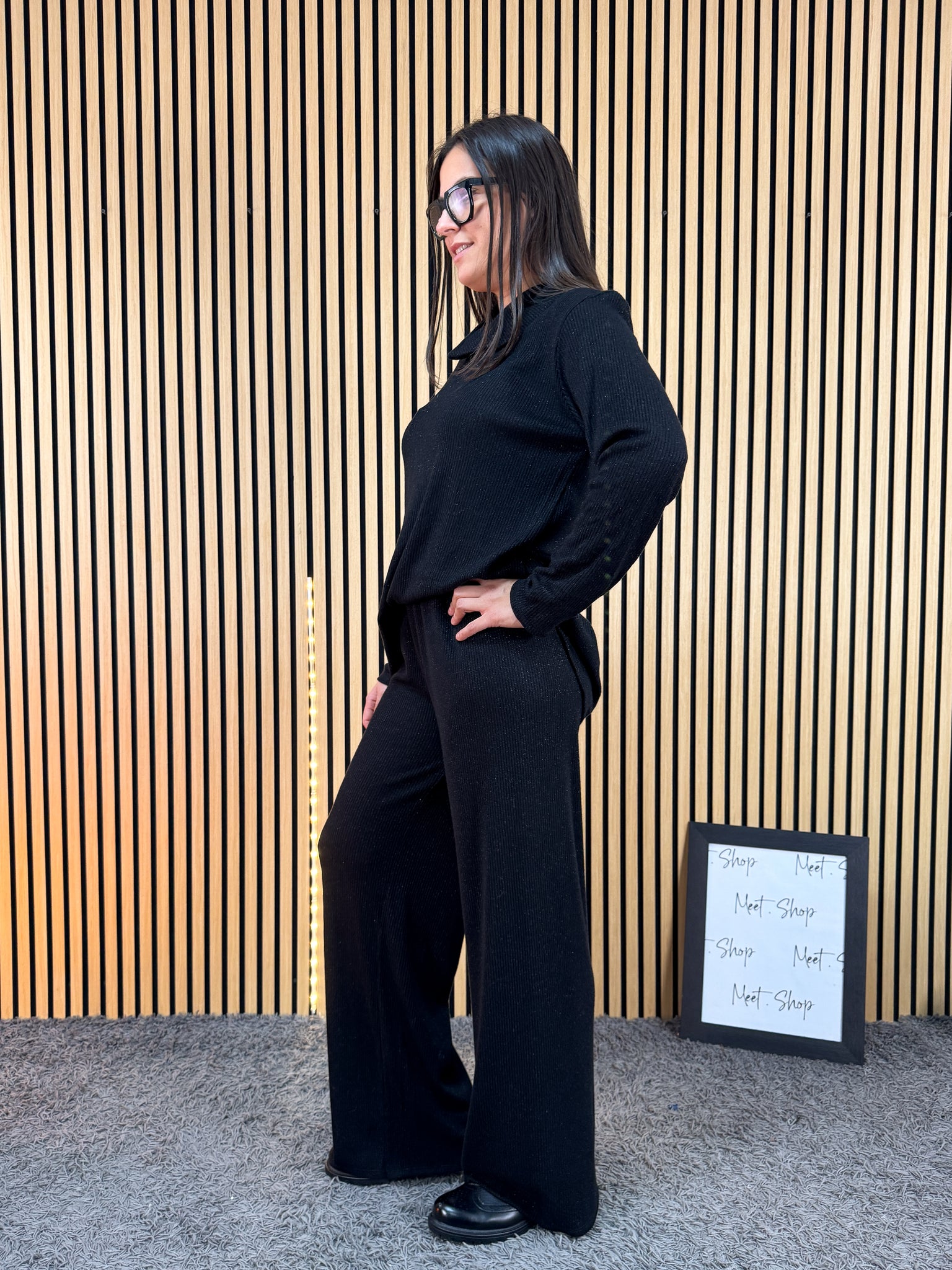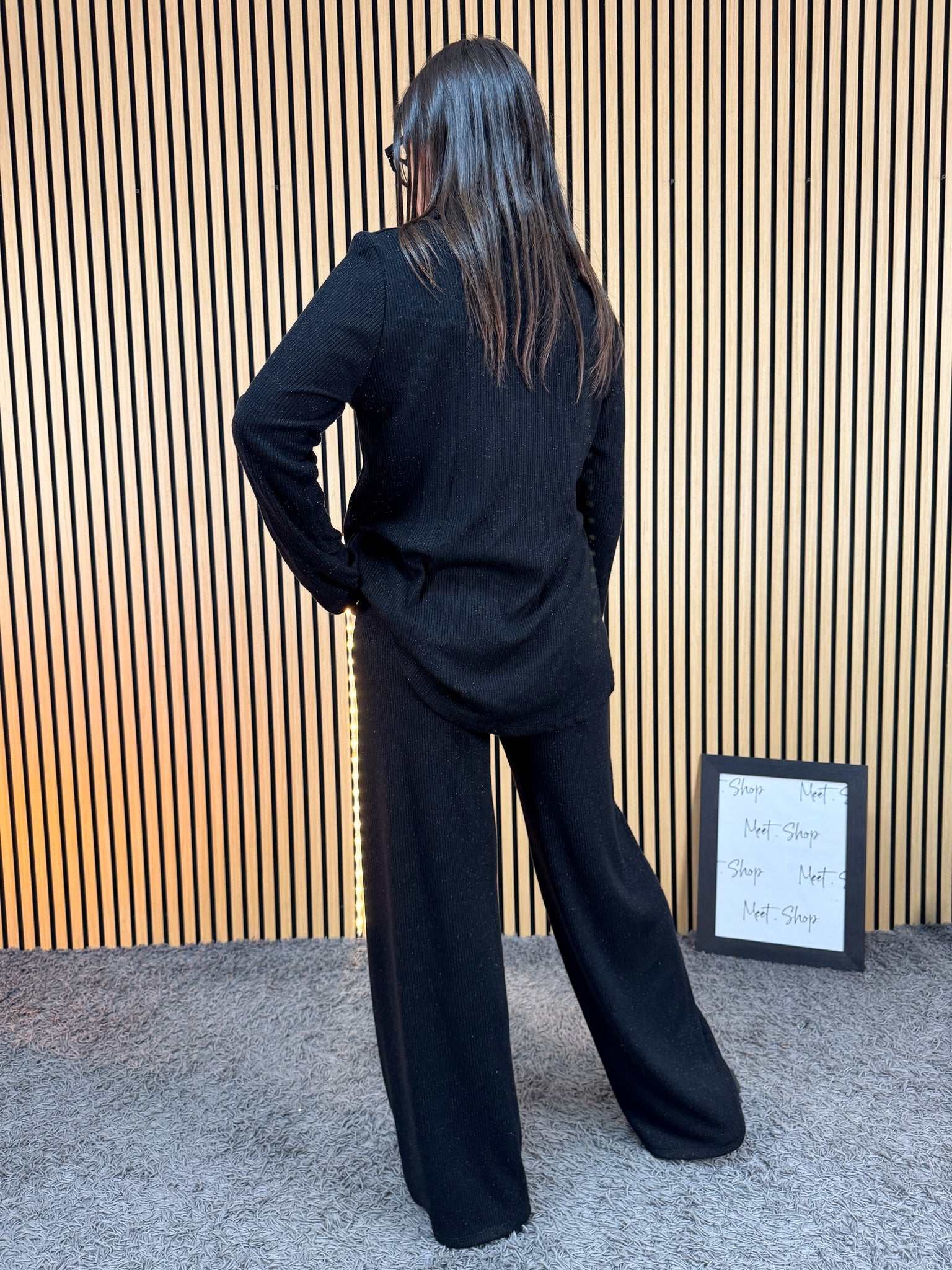 Pantalone in viscosa elasticizzata con filamento di lurex, abbinato alla maglia Over Cristina