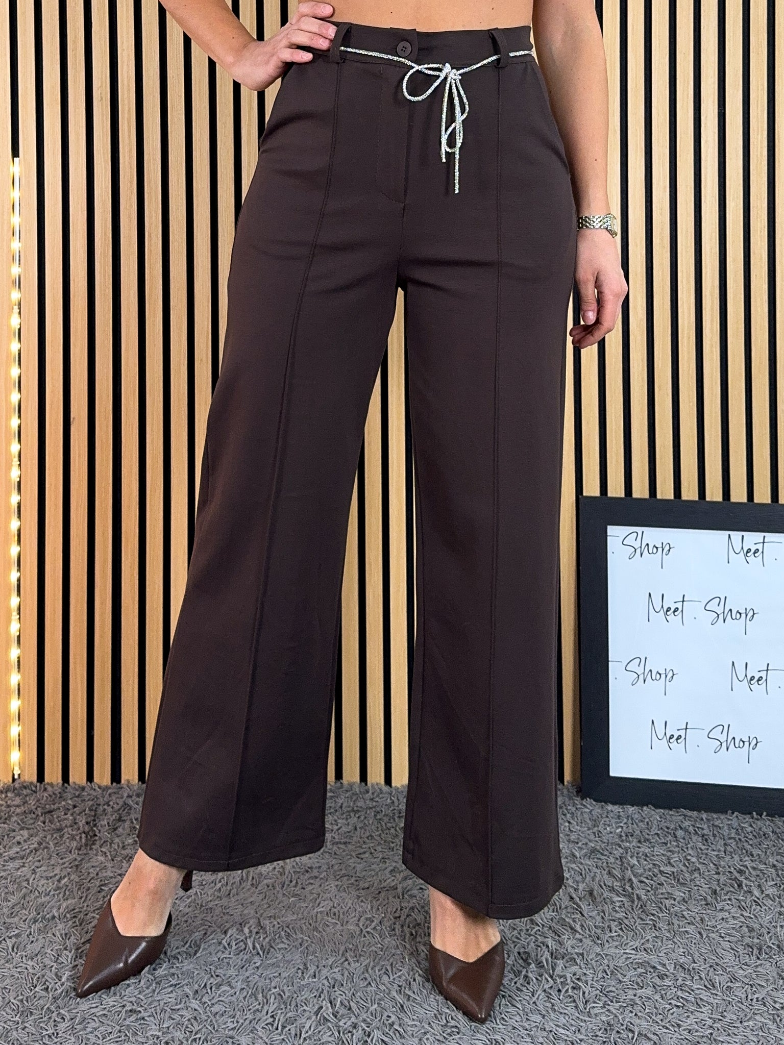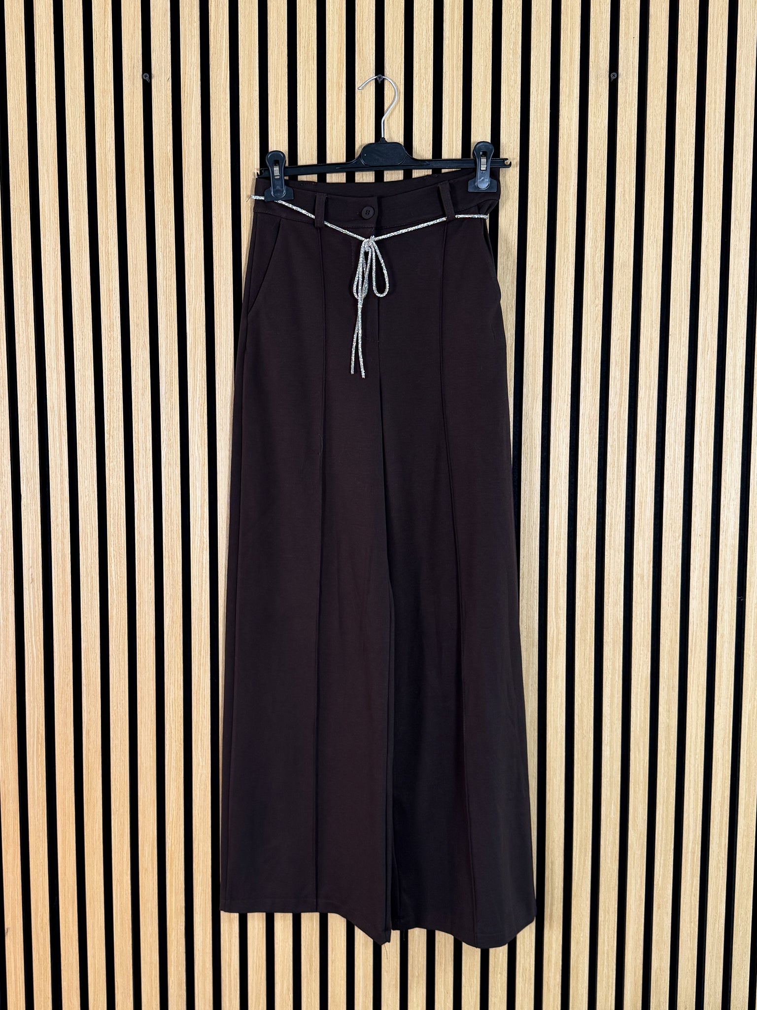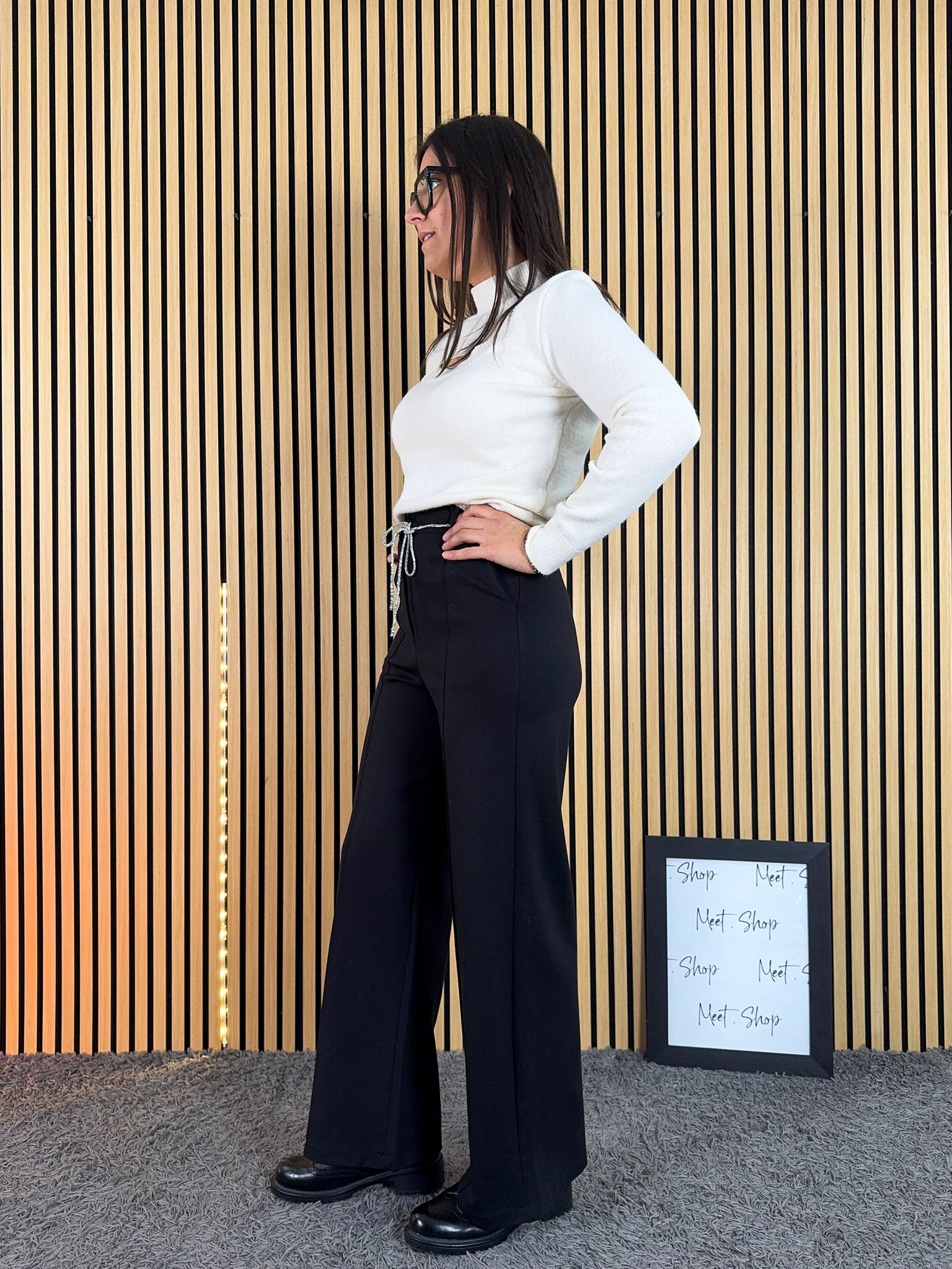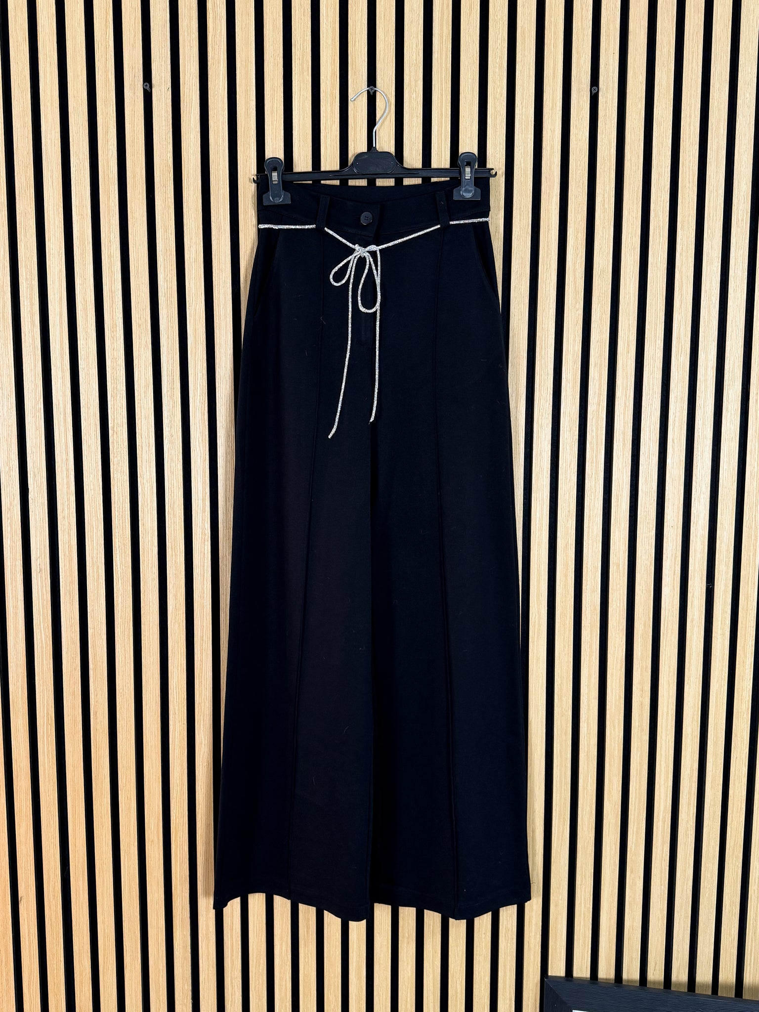 Pantalone a palazzo vita alta in viscosa elasticizzata con bottone e zip